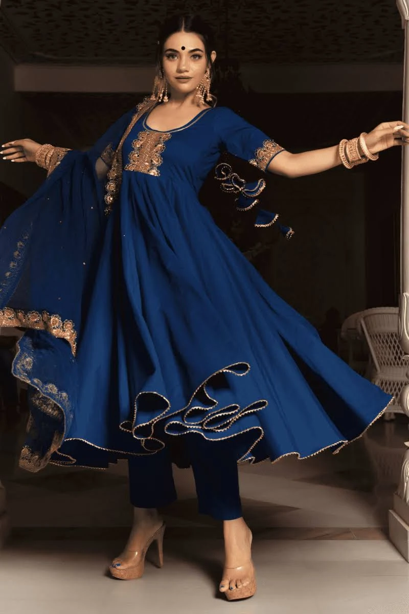 A breezy, all‑day wearable blue kurta set that’s perfect for casual wear—made from breathable cotton and styled in a flattering Anarkali silhouette. The rich blue base features delicate prints, giving it a traditional yet relaxed look you can wear to casual outings, informal family get‑togethers, or daytime errands without feeling overdressed.