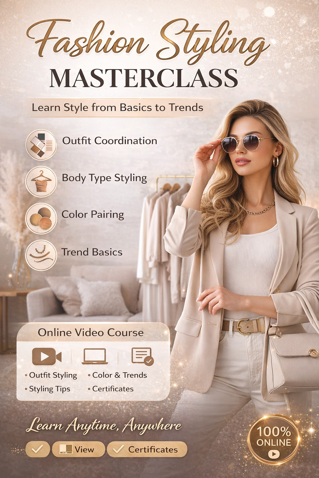 Step into the world of fashion with the Fashion Styling Masterclass, a comprehensive virtual course designed for beginners and fashion enthusiasts. This course teaches you the fundamentals of styling, color coordination, body types, outfit planning, and current fashion trends—all in an easy, practical format.
