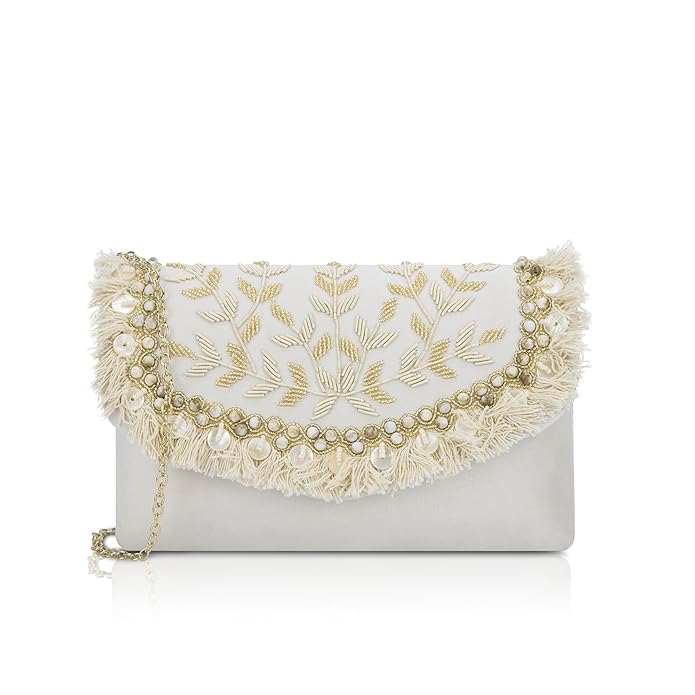 - Featuring stunning embroyidery work and an elegant silhouette, this clutch is a must-have accessory for any woman looking to add sparkle and shine to her special day.